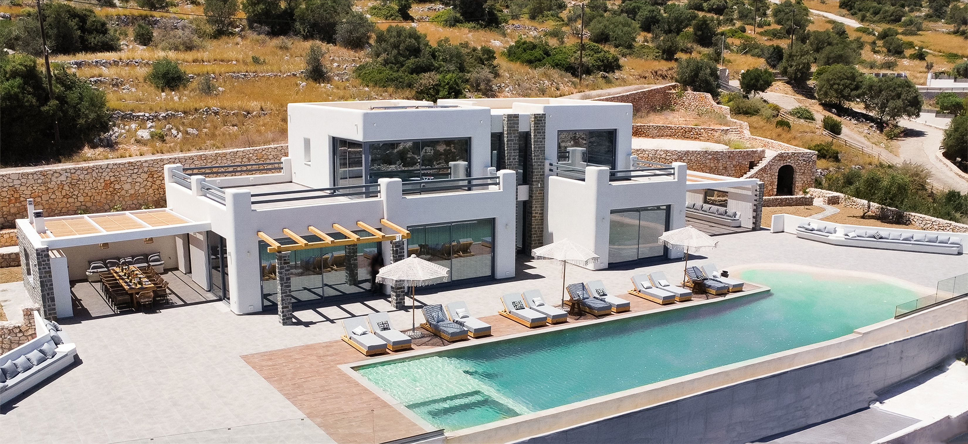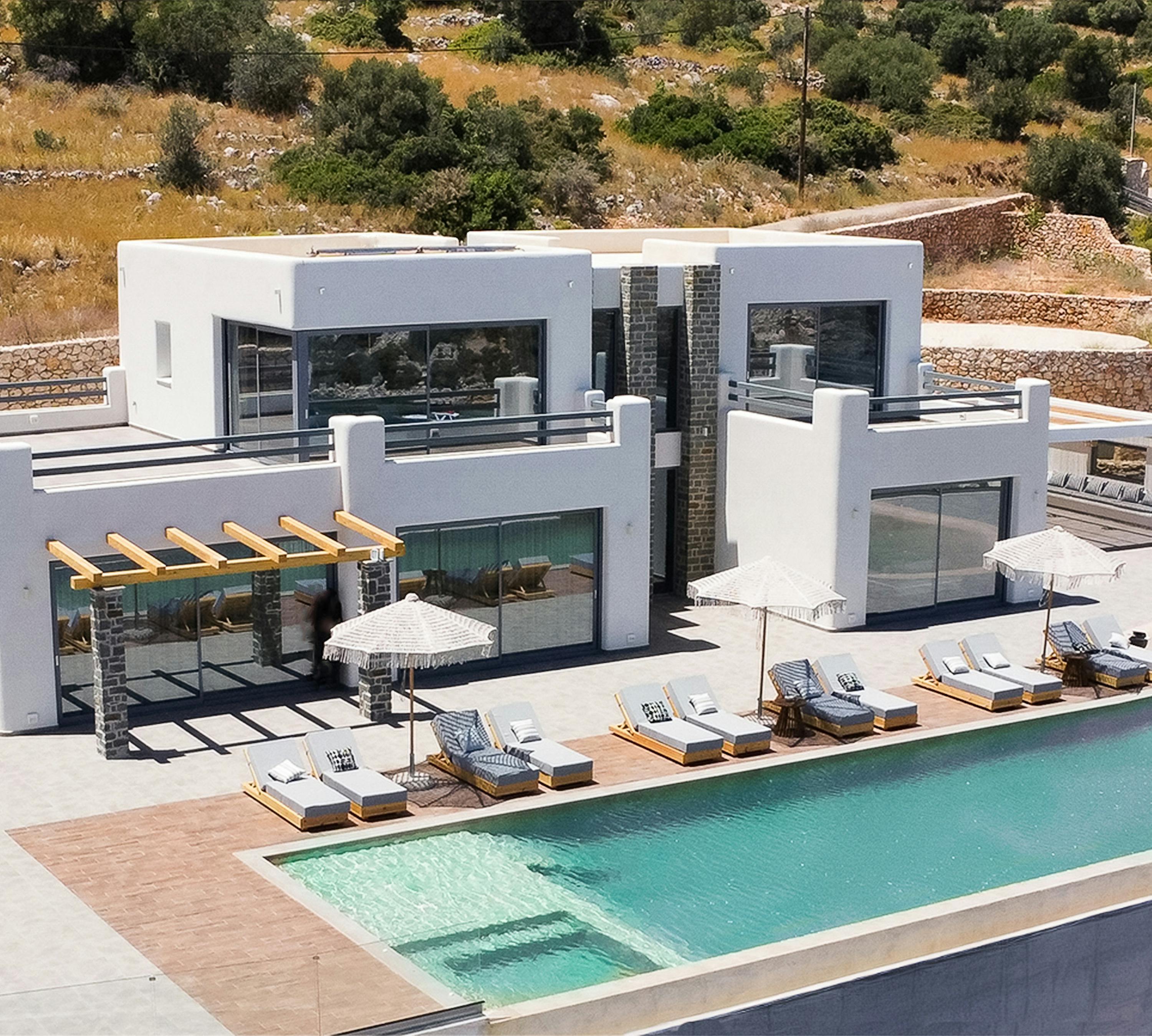 Villa Argo is a contemporary, clean-lined retreat that sits perched above Agios Nikolaos port with sweeping sea views, five double bedrooms, and a unique sandy-beach-effect infinity pool.