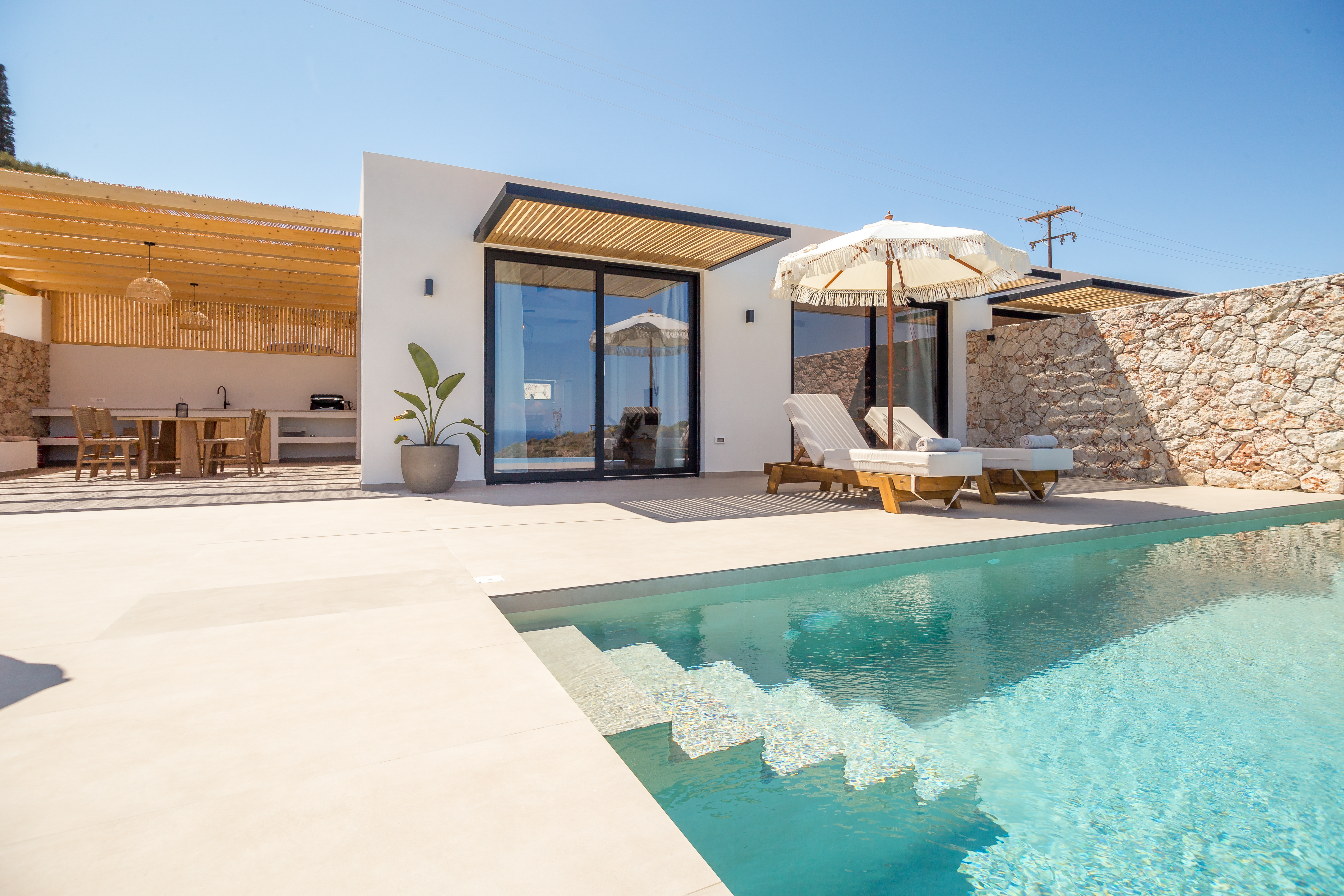 Offering endless sea views, modern, minimalist interiors, and an unbeatable location, Iris ticks all the boxes for a fuss-free Greek escape. The beautiful outside space showcases a private pool and dining area, making it an idyllic place to wind down after a busy day at Peligoni.