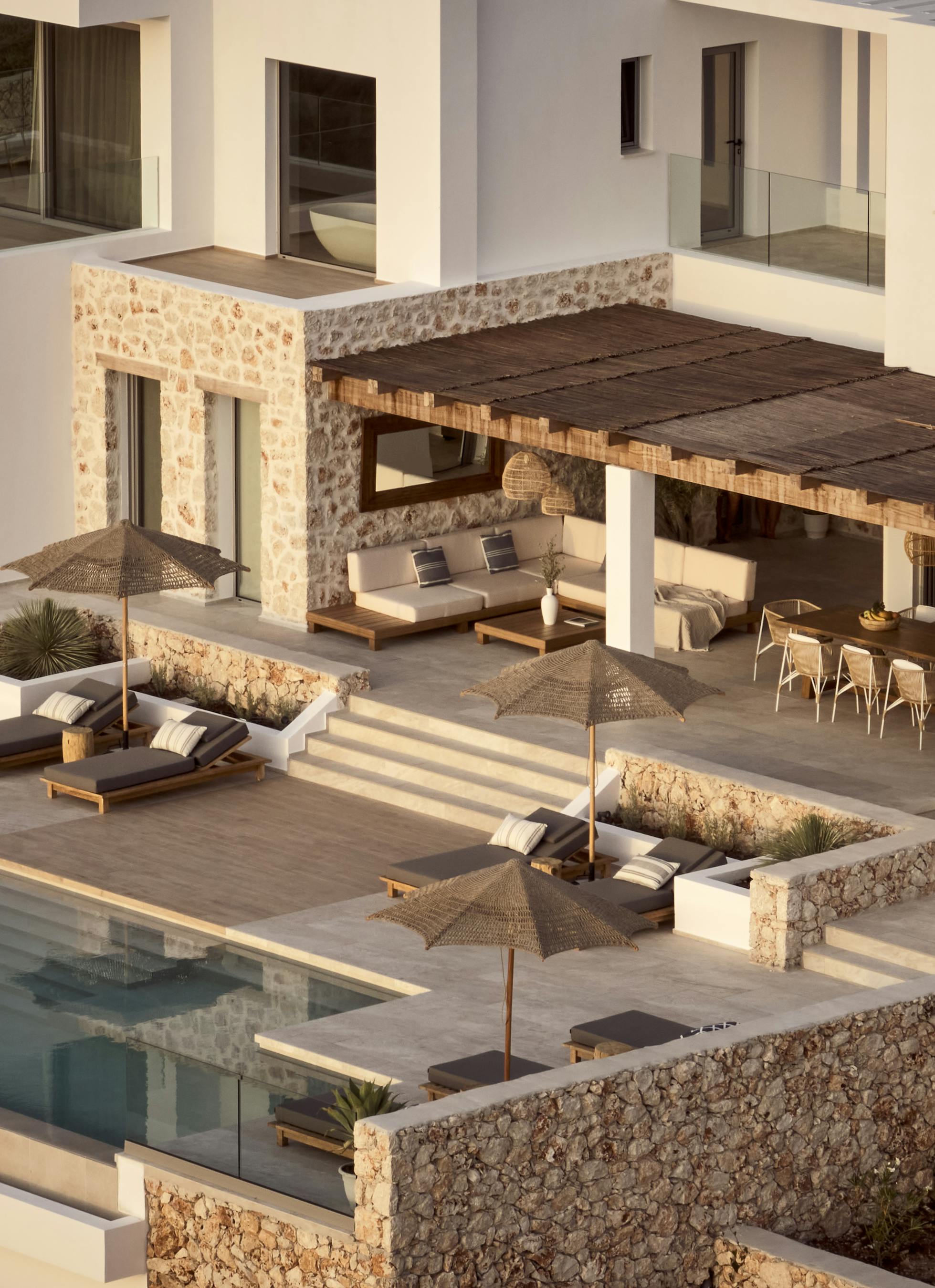 Kyanos has five stylish bedrooms. All have their own bathrooms and some have sweeping terraces. The minimalist interiors are finished with raw, natural materials and fabulous rattan features.